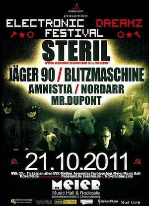 Steril unterbrechen ihre arbeiten am sechsten Studioalbum um eine einzigartige und exklusive Show dem Braunschweiger Publikum präsentieren zu können. Denn ausschließlich Songs aus ihren ersten beiden Alben werden die Oldenburger an diesem Abend auf dem Festival spielen, also „Back to the Roots“.  Ein Special für alle Oldschool EBM Fans !!! Wer die sympathischen Oldenburger schon mal Live erleben durfte weiß was für eine Energiegeladene Show sie uns präsentieren werden, in ihrer 20 Jährigen Bandgeschichte sind sie mit allen Wassern gewaschen. Nach vielen Jahren endlich zurück, und glücklicherweise auch  Live in Braunschweig zu erleben. Unser Headliner 2011!!!
